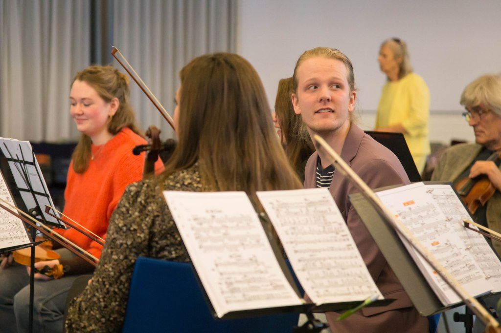 Naast heel hard werken is er in het orkest ook ontspanning, grapjes, soms hilariteit. Jelmer Scholte (2e violen) kijkt even met een grijns naar het koor dat de opdracht krijgt van Ronald Slager om meer dramatiek in hun zang te brengen. Concertmeester Syl van Heeringen kijkt toe.