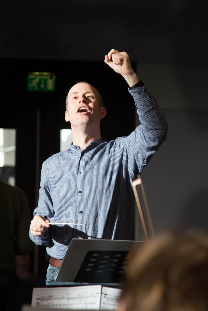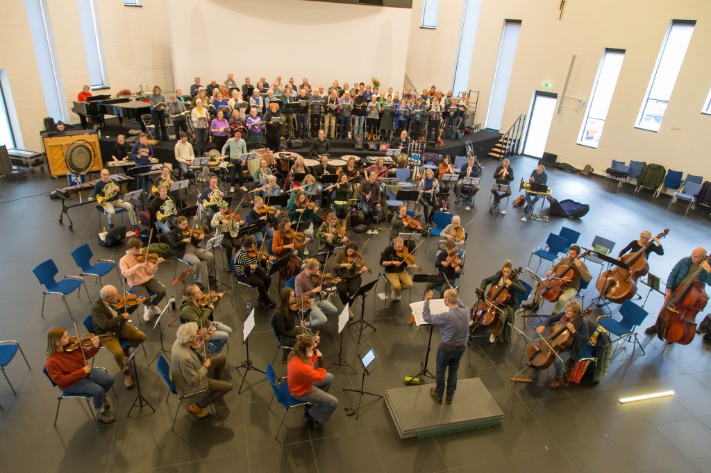 Zaterdag 11 november was de eerste repetitie waarin alles samenkwam. Orkest van De Nije Symfony, het koor van Collegium Vocale Fryslan, ingestudeerd door Gerben van der Veen, solisten Joep van Geffen (bariton), Fardau van der Woude (sopraan) en Rikkert van Huisstede (tenor en acteur), dansers van ‘Dance Connects’ uit Amsterdam Anna Riley-Shepard, choreograaf en regisseur Mayke van Veldhuizen en dramaturgisch adviseur Gooitsen Eenling. Een enorme cast. Altijd spannend en ook inspannend. Zal het in elkaar passen? Lukt het om alles op elkaar af te stemmen?